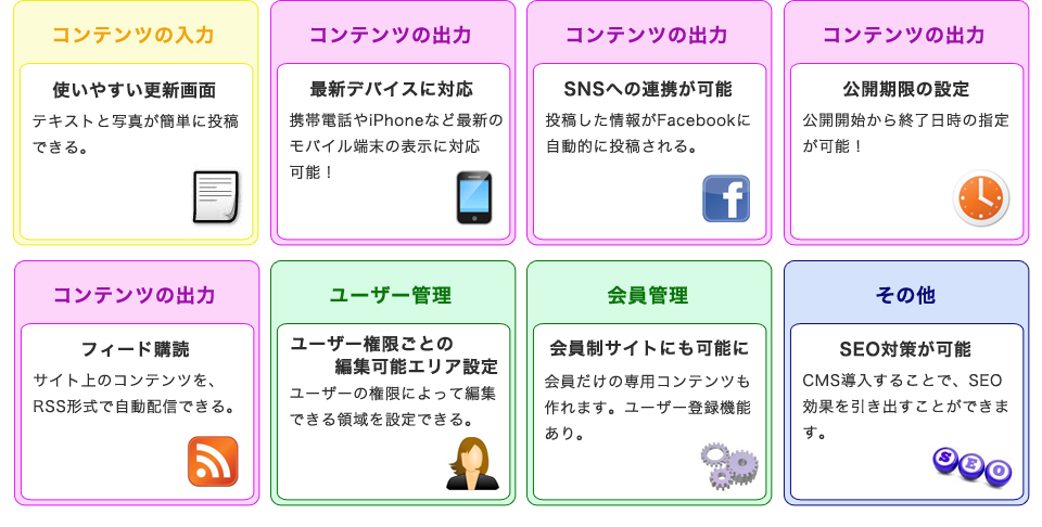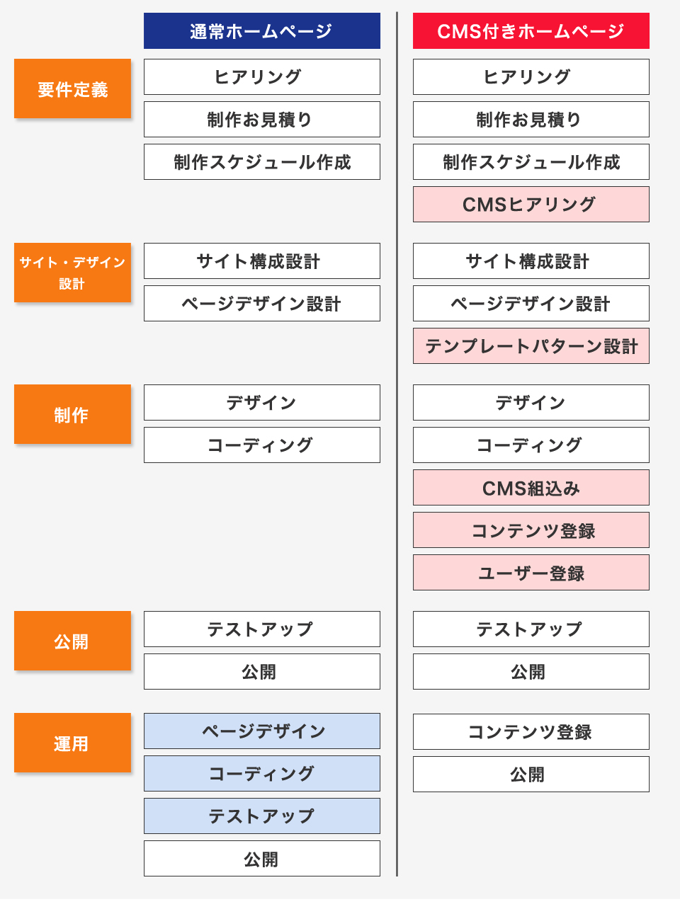 運用面においては、通常制作サイトに比べ、コンテンツ更新機能がついているCMSではコンテンツ追加削除等が容易にできるため、新規にコンテンツを追加するたびにその都度ページ制作(デザイン・コーディング)をする必要がありません。